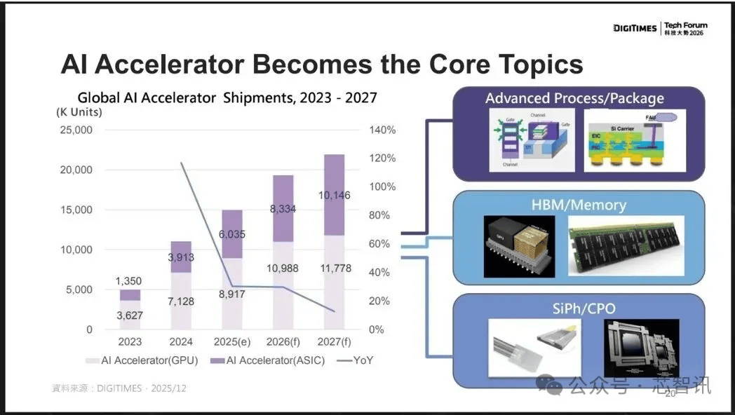 根据DIGITIMES分析师姚嘉洋分析,2026年应用于数据中心的ASIC将达到833万颗,虽然大幅低于AI GPU的出货量,但2027年数据中心ASIC将突破1000万颗,达到接近同期的GPU的1177万颗的销量。